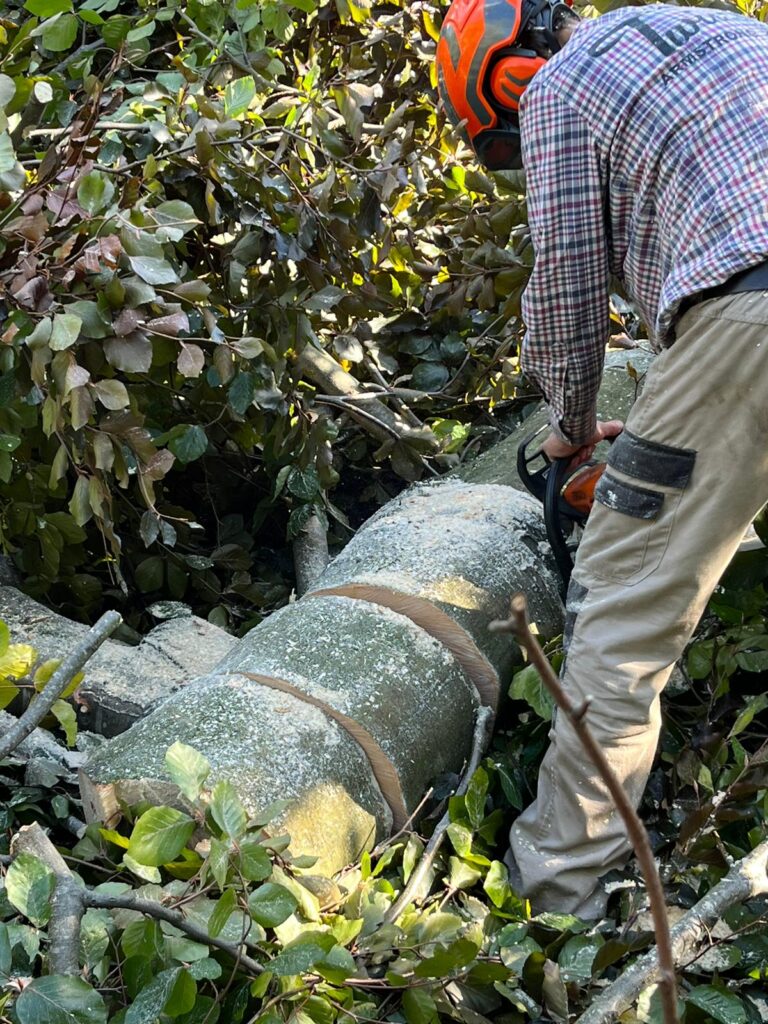 Gelukkig konden alle takken vrij vallen. Door toepassing van de juiste zaagtechnieken vallen ook grote takken zonder schade aan te richten. Veel ervaring is hierbij wel belangrijk.