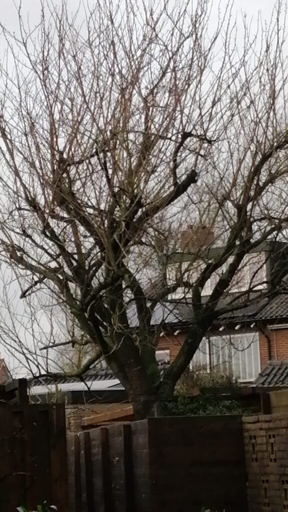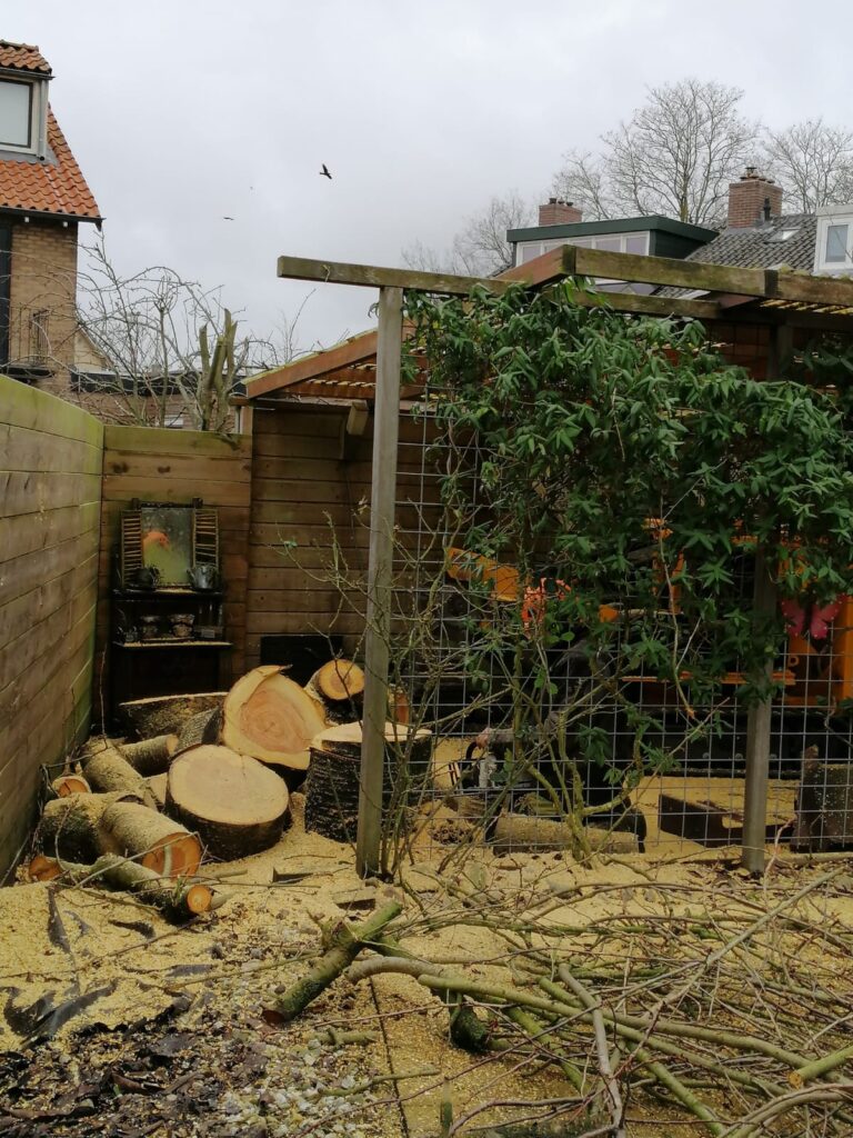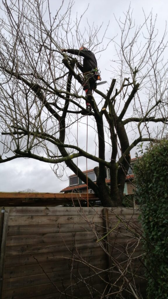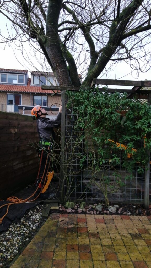In Harderwijk vandaag een dikke sierkers gekapt. Deze boom stond over een overkapping en aan de andere kant een schutting. Krappe ruimte om te werken dus. En voorzichtig zijn ivm de overkapping met kwetsbaar dak.